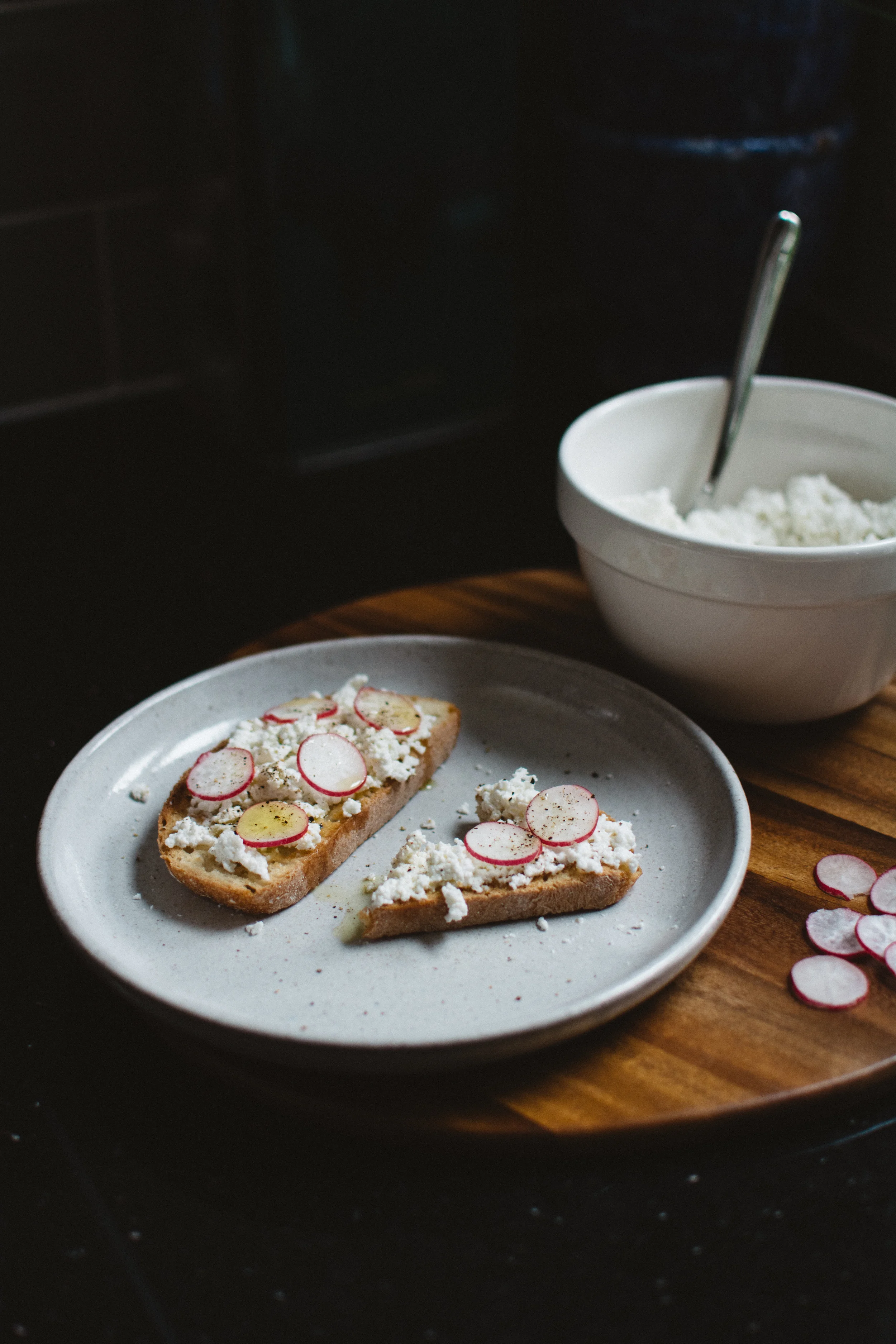 Luckily, when it comes to cheese, ricotta is probably the easiest to make at home. All it takes is three ingredients, a thermometer and a muslin cloth and pow, you've got the good stuff. How does it work I hear you say? Heat milk until scalding, pour in your acidity (white wine vinegar, lemon etc), add a pinch of salt and then leave it be before straining and slathering onto sourdough toast topped with radish slices and freshly cracked pepper. Or whatever else you fancy.